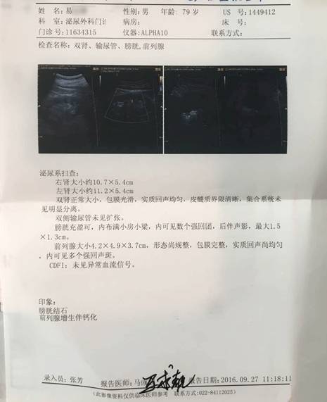 近日,易大爷在网上看见了天津百信医院“取石”的消息,颇为心动,遂在家人的陪同下来到了这里。在B超检查中发现,在易大爷的膀胱内有4颗大小不一的结石,较大的一颗直径达到了1.5cm!由于结石的挤压与堵塞,造成了易大爷膀胱肿胀和前列腺肥大;同时因为结石堵住了输尿管出口,导致其排尿困难,而据易大爷亲口讲述,由于排尿困难,他不敢多喝水,也不敢出门,生怕尿意来时控制不住,一度被折磨的夙夜难眠,整个人憔悴不堪。