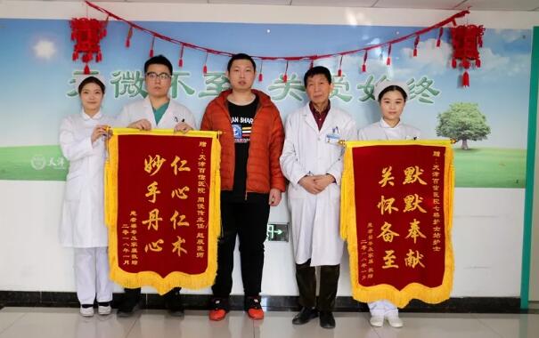 1月9日早,已出院的梁女士家人专程将两面锦旗送到百信医院周俊传主任和陈步峰大夫的手中,以表示对众多医护人员的衷心感谢。 这两面锦旗,体现了患者对周主任和陈大夫医术的信任与认可,彰显出对天津百信医院全体医护人员工作的肯定和信任。